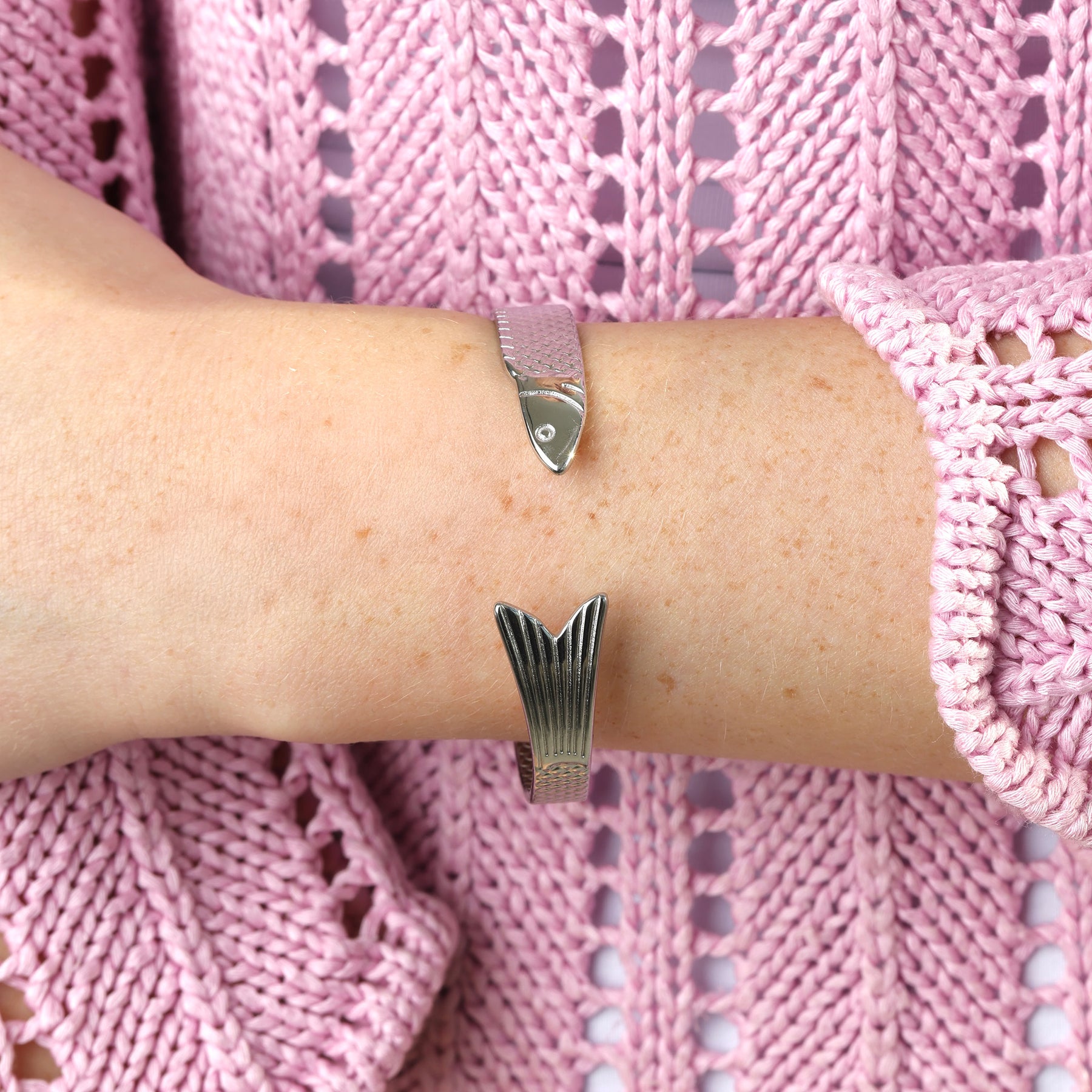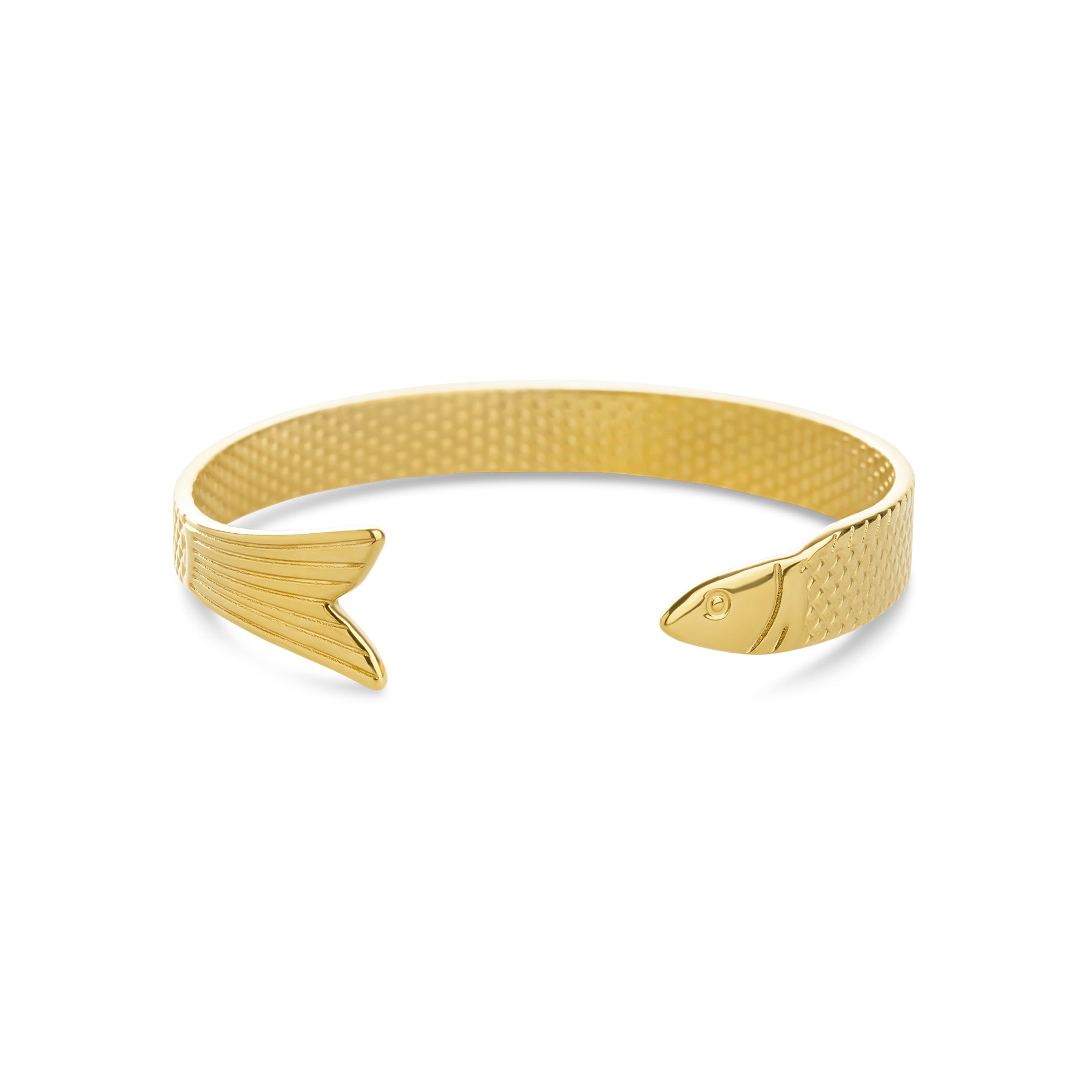 A fish-detailed bangle bracelet in waterproof stainless steel. Available in silver & gold.